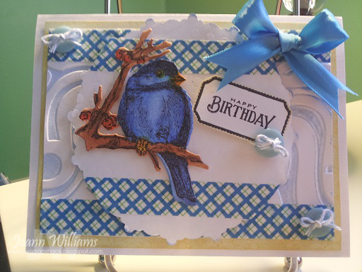 I love this card! I am have a special place in my heart for birds since I married one (Marye Bird). I love the embellishments and Blue is one of my favorite colors. You did a really nice job on this one.